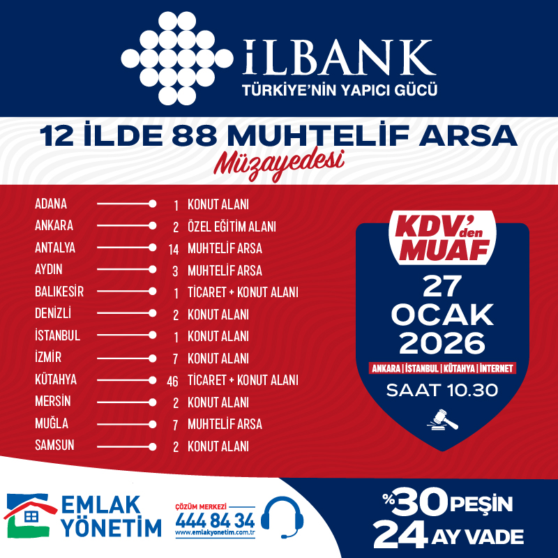 27 Ocak 2026 12 İlde 88 Muhtelif Arsa Satışı Müzayedesi Bilgilendirme Talebi Hk.